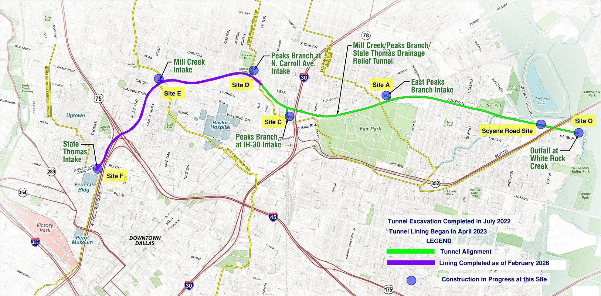 The MCPBST Tunnel, aka the Mill Creek Tunnel, will be 26,308 feet (5 miles) long, between 120 to 175 feet deep, with finished tunnel diameters of 30 feet and 35 feet. The Mill Creek Tunnel excavation began at the Outfall Shaft off Barber Avenue and ended at Shaft F by the Maple-Routh Connection and Woodall Rodgers intersection. The tunnel was excavated with a hard rock main beam Tunnel Boring Machine (TBM), named "Big Tex", through a weak limestone formation called Austin Chalk. The TBM was manufactured by the Robbins Company, assembled and tested on-site on the surface utilizing Robbins’ patented Onsite First Time Assembly (OFTA) method. After factory field testing, the 230 feet long TBM with four gantries was disassembled and lowered down into the Starter Tunnel, re-assembled, re-tested and launched at the end of April 2020. The TBM diameter was converted from 37’-7” to 32’-7” below the ground in the tunnel to accommodate two different bore sizes of the tunnel. Excavation was completed in the Summer of 2022.